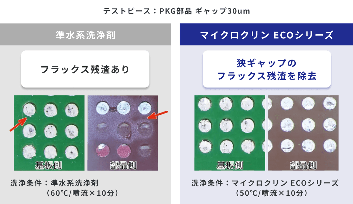 新発想の洗浄メカニズムにより、これまでの洗浄剤では困難だった狭ギャップのフラックス残渣に対しても強力な除去性を実現しました。