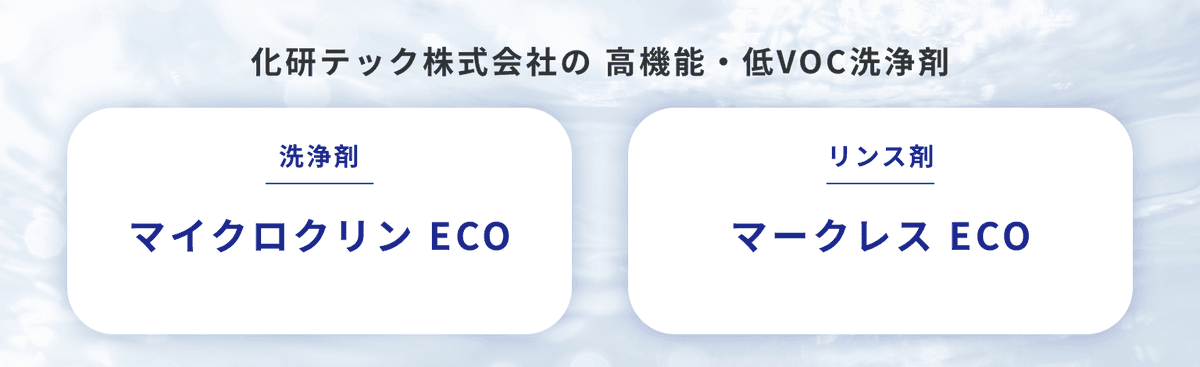 化研テックでは、更なる高精密洗浄と環境への対応を両立した高機能・低VOC洗浄剤 マイクロクリンECO / マークレスECOシリーズを開発しました。