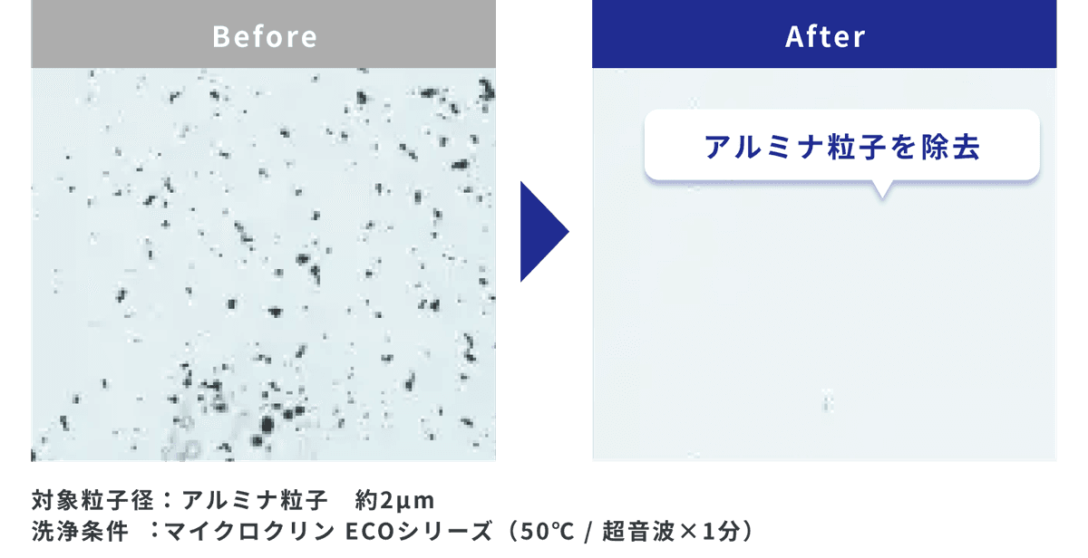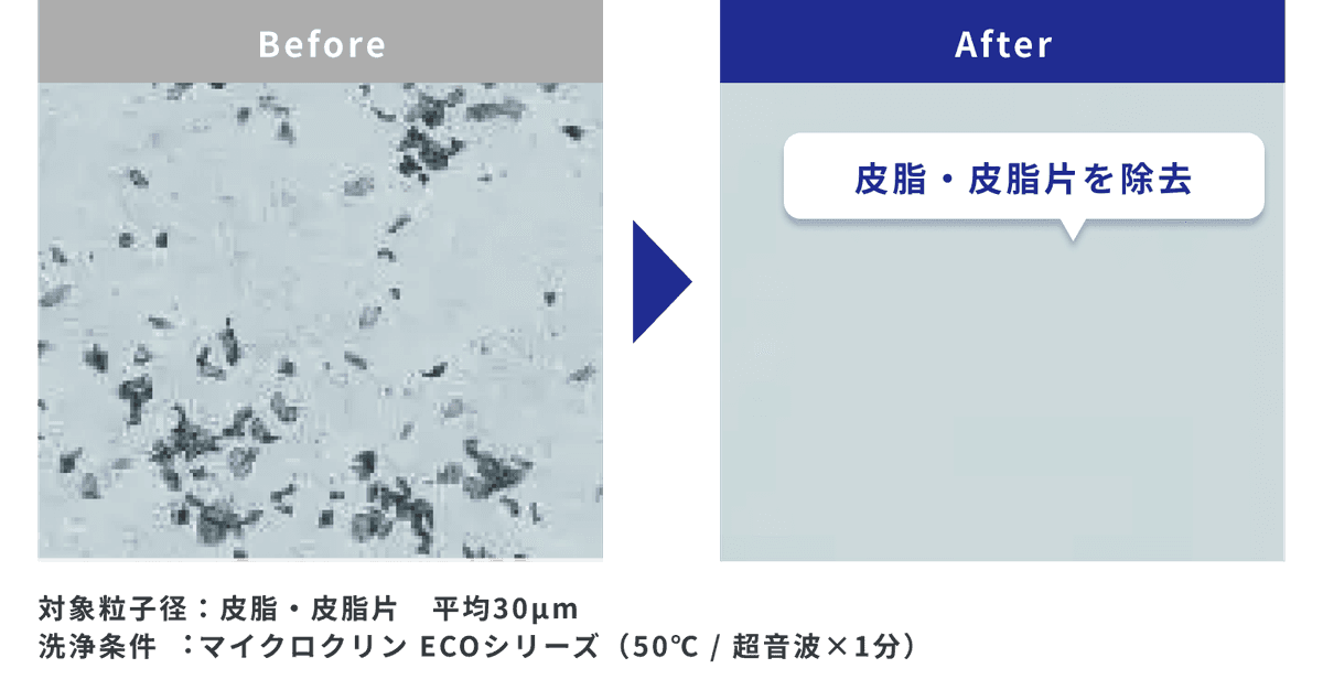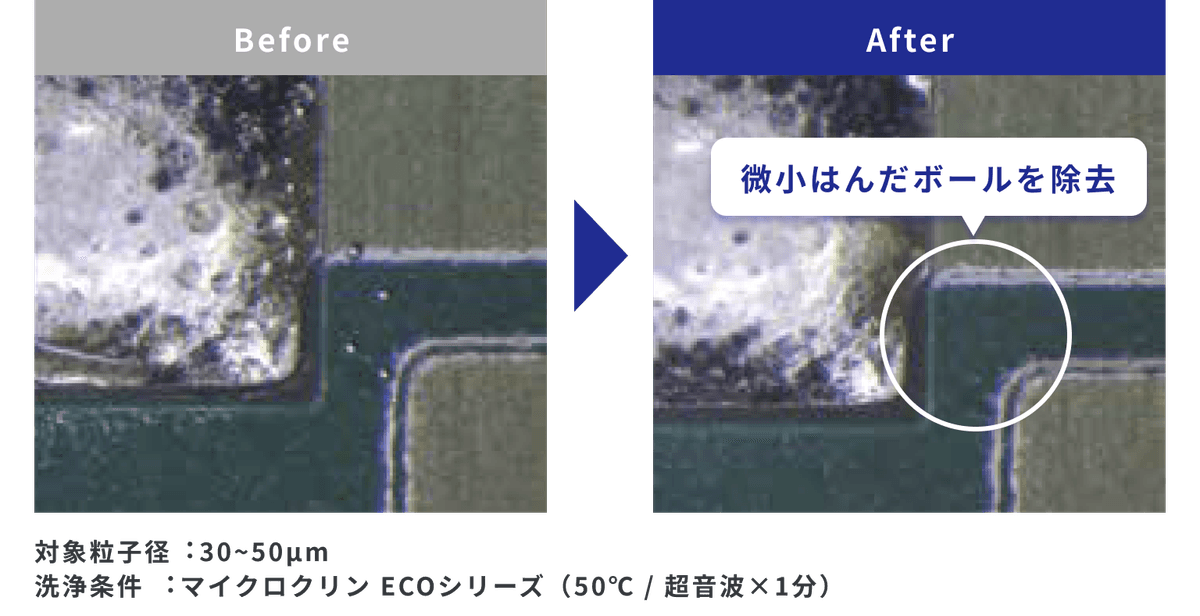 従来のフラックス洗浄剤では除去が難しかった微小はんだボール、皮脂、微粒子などパーティクルの除去性にも優れています。