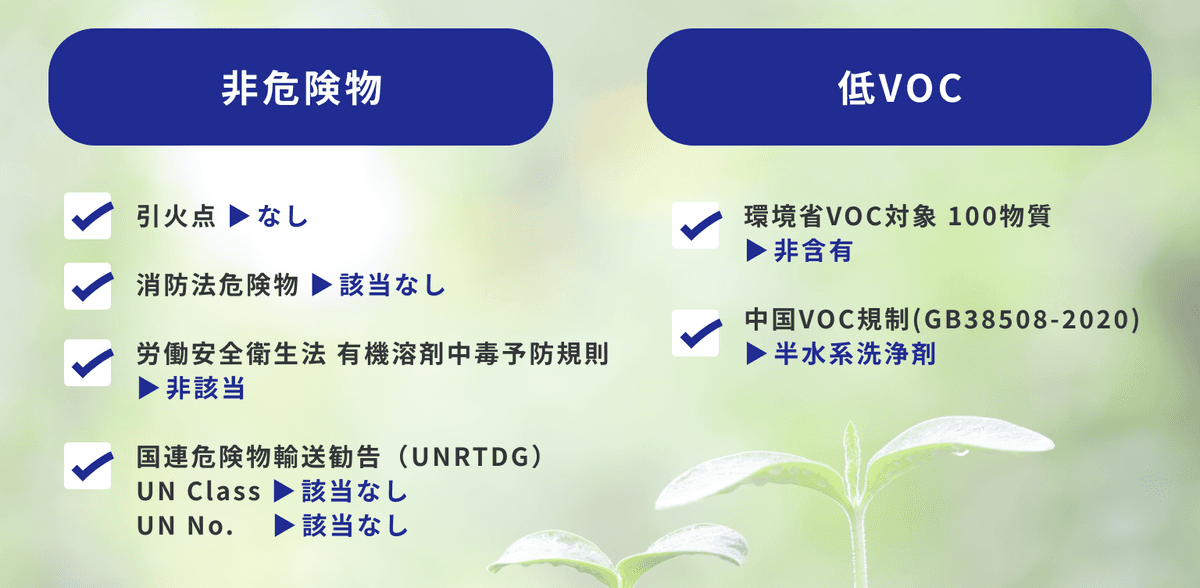 中国において2020年12月に施行された、洗浄剤中のVOC含有量の制限に関する強制国家基準(GB規格)においても半水系洗浄剤に該当し、中国国内で問題なく使用可能です。