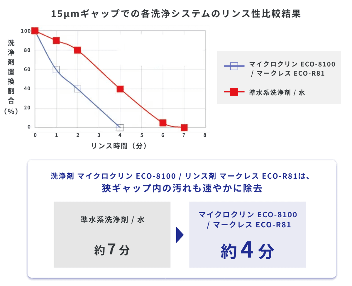 リンス完了までに要する時間は、準水系洗浄剤 / 水で約7分かかったのに対し、フラックス洗浄剤 マイクロクリン ECO-8100 / リンス剤 マークレス ECO-R81においては約4分と、半分近くにまで短縮できました。