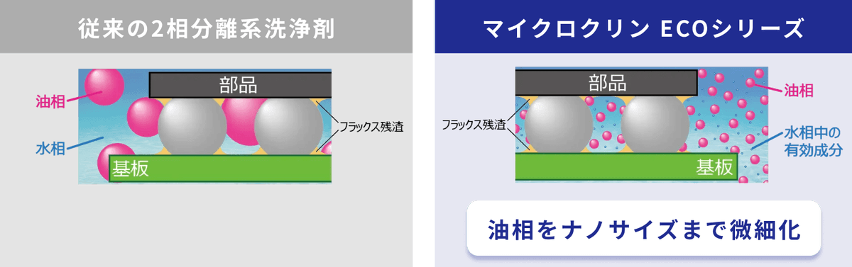 当社の従来の低VOCのフラックス洗浄剤は、油相と水相に相分離する成分により、フラックス残渣を洗浄していました。マイクロクリンECOシリーズでは、油相をナノサイズまで微細化し、従来のフラックス洗浄剤では洗浄できなかった狭ギャップのフラックス残渣の洗浄を実現しました。