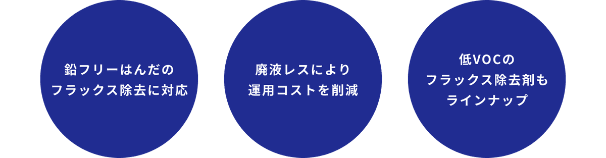 当社は、はんだの鉛フリー化に伴うフラックス洗浄の難化をいち早く予測し、世界で初めて鉛フリーはんだフラックス対応洗浄剤を開発、商品化しました。すでに多くの導入実績があり、お客様にもご好評いただいています。