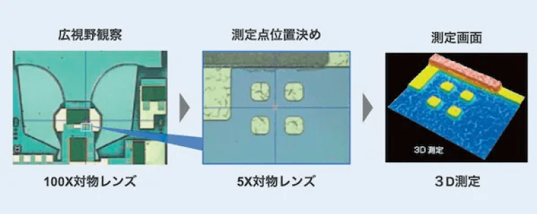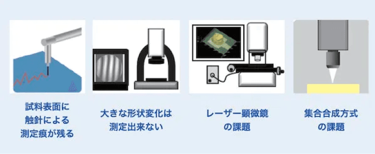 斜面の測定が苦手 / 視野内しか測れない / ミリオーダーの大きな反りは測れない