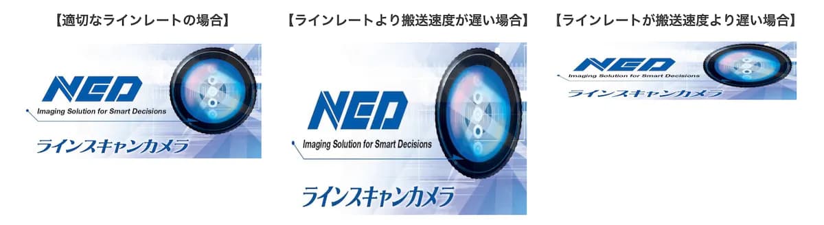 「ラインレート」とは、1秒間にスキャンできるライン数を示す指標です。ラインスキャンカメラは被写体をスキャンするか、あるいはカメラ自体を移動させて撮影する必要があり、この移動速度を「搬送速度」と呼びます。搬送速度とラインレートが適切でない場合、下記のように画像に伸び縮みが発生する可能性があるため注意が必要です。