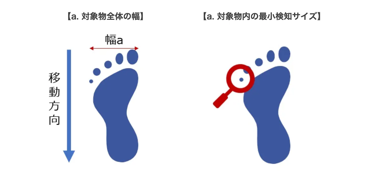一方、足あと内で最も小さいのは小指部分です。縦/横のうち短いほうの長さ(最小検知サイズb)を測定します。