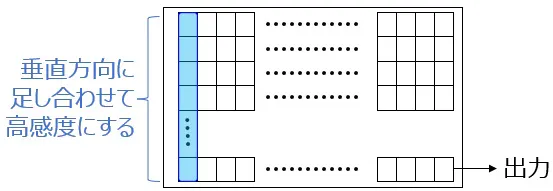 TDI | 32、64、または128のラインが垂直に配置され、データを結合して高感度を実現する仕組みです。 このプロセスでは、電荷が物理的に伝達され、全画素のデータが最下部のラインから出力されます。 ![]() |