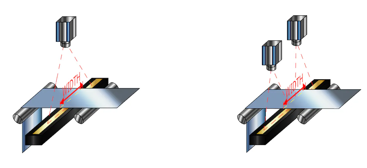 幅計測 | 対象部材(ゴム、鉄、フィルム、紙など)の幅を連続測定します。 被検査物体がカメラと照明の中を通過する際、照明からの光がカメラに射す光路を遮断します(遮光)。 この遮光された領域は、カメラに内蔵された受光素子(センサ)で検知され、その遮光された画素の数と画素ごとのウェイトを利用して、物体の幅が計測されます。 幅の広い対象物や高い精度が求められる場合は、システムの構築においてカメラの数を増やすことが考えられます。 ![]() |