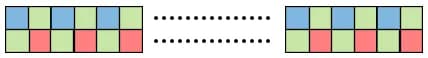 2ライン | 2つのラインセンサーには、赤/緑/青のフィルタが配置されています。 人間の視覚システムが緑に対して感度が高いことから、緑の占める割合が多くなっています。 ただし、輝度差の大きいエッジ部分では時折偽の色が現れます。この問題を軽減するために、補間データを生成して偽色を減少させます。 ![]() |