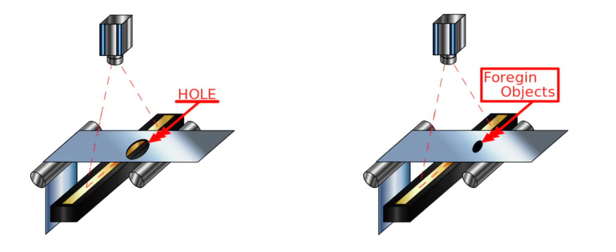 欠陥検出 | 対象部材を連続監視し、穴あきや異物などの欠点部を検出します。 検査対象物とその中で生じる欠陥(穴や異物の混入など)部分に差異がある場合、これを検知します。差異が大きければ大きいほど、検出が容易になります。また、検知可能なサイズや数は機器の性能に依存します。 異物が発生した箇所で、製品部分(正常な部分)との差異がある場合でも検出が可能なことがあります。 ![]() |