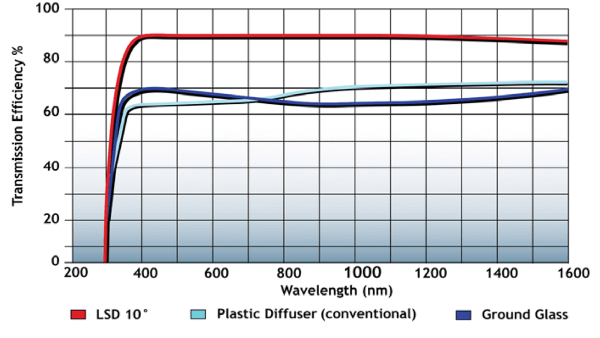拡散角度により異なりますが400nm~1100nmの波長域で85%~90%の高い透過率を実現しました。LEDなどの微弱な光源のパワーを充分に活用できます。