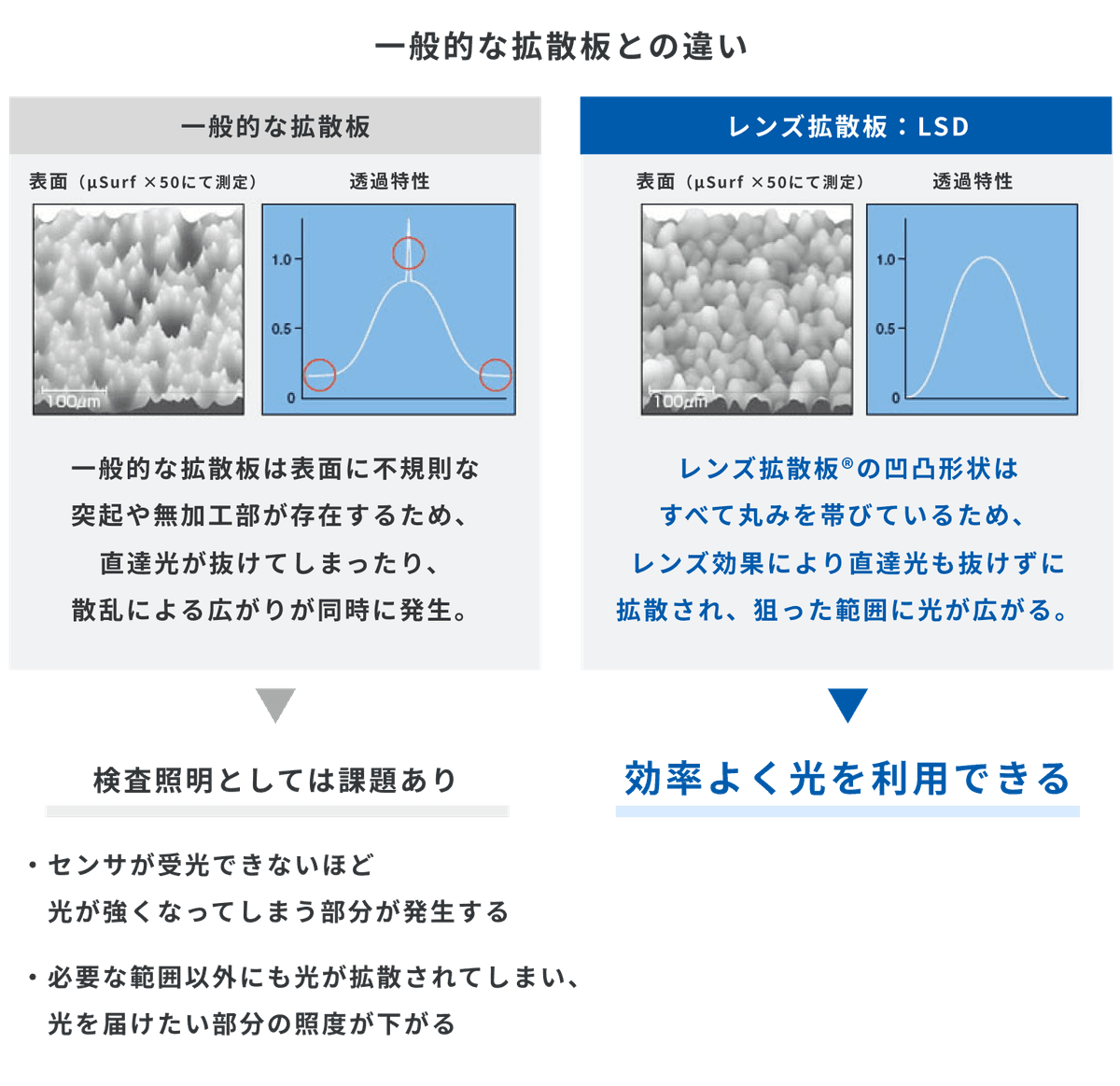 レンズ拡散板:LSDは、名前の通り表面の構造体がレンズとして働き、光を屈折させることで拡散させます。