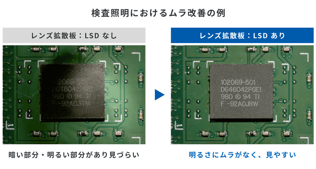 均一な照明により、処理速度の向上に貢献。照度ムラによる画像処理時のエラー誤検知などを防ぐ目的でも、レンズ拡散板:LSDが選ばれています。