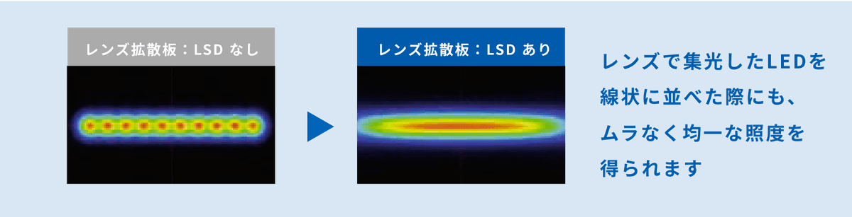 いずれの製品も、拡散した光の均一性が高く、拡散角度も保証されています。そのため、産業用装置の光源部分など、高精度で光のコントロールが求められる用途においても安心してご使用いただけます。