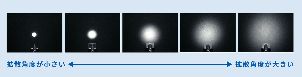 お客様のニーズに合わせて、円形(広い拡散、中拡散、狭い拡散)、または楕円・線状 (一方向に大きく広がる)拡散を選べます。