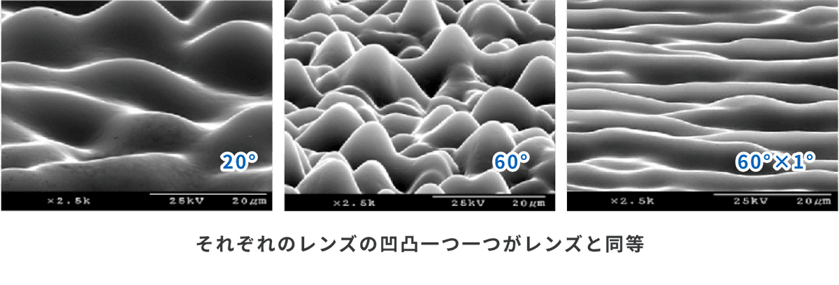 また、これらレンズの完全にランダムな配置が光源の輝度ムラを緩和させているため、均質な照明を実現します。