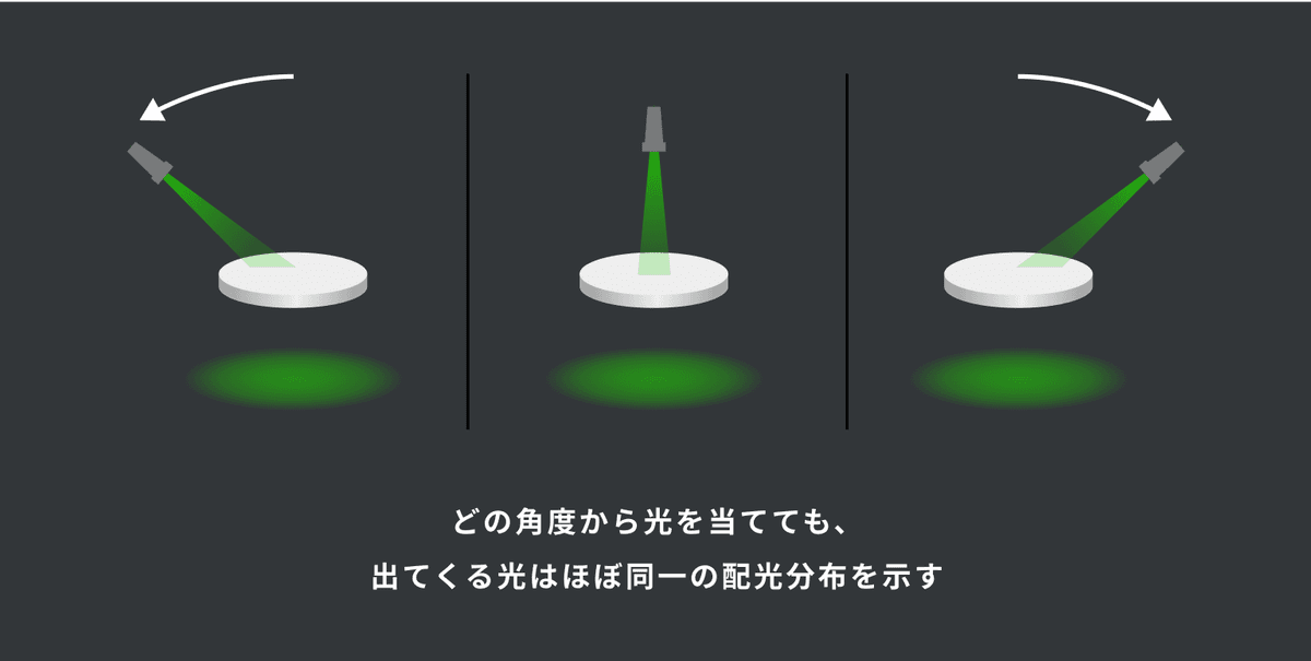 他の拡散板と違い入射角依存が少なく、出てくる光はほぼ同一の配光分布を示します。