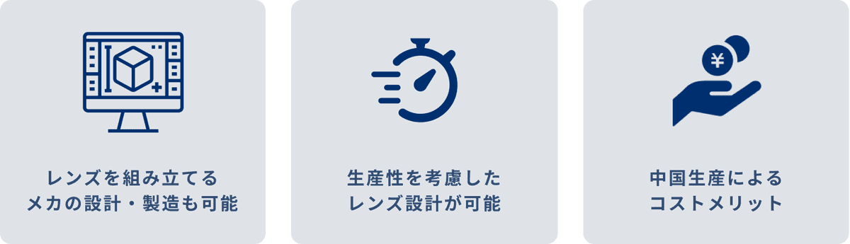 設計から生産まで一連のノウハウがあるため、生産におけるコストや納期などを考慮したレンズ設計を行います。また、生産は中国の提携工場で行うため、さらに生産コストを抑えています。